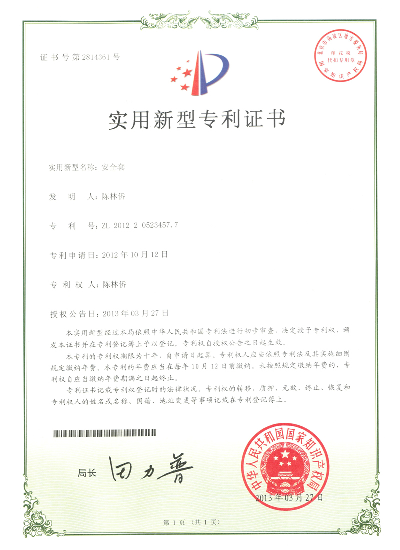 為了解決男女性生活的不和諧因素,廣州市康祥實(shí)業(yè)有限公司,歷經(jīng)幾年,發(fā)明了多款新型的安全套,并已成功獲取專利證書。專利的獲得將有利于發(fā)揮康祥公司自主知識(shí)產(chǎn)權(quán)優(yōu)勢(shì),繼續(xù)保持行業(yè)技術(shù)領(lǐng)先與提升公司的核心競(jìng)爭(zhēng)力,使康祥公司發(fā)展得更強(qiáng)更大,并且為世界人民的生殖健康以及“性福”生活提供保障。以下為部分專利證書介紹: