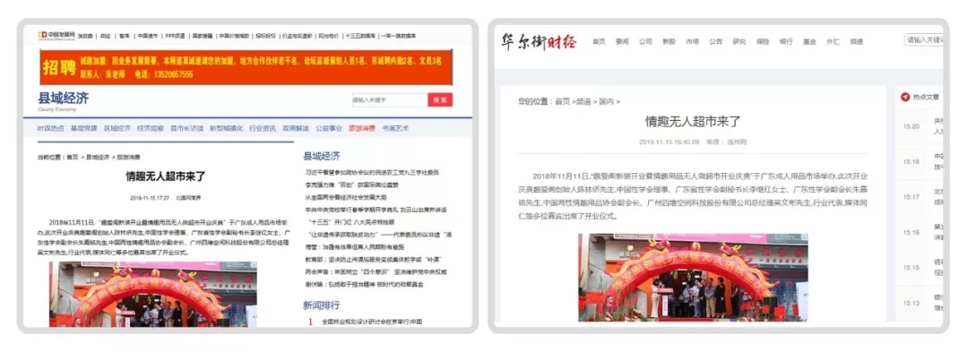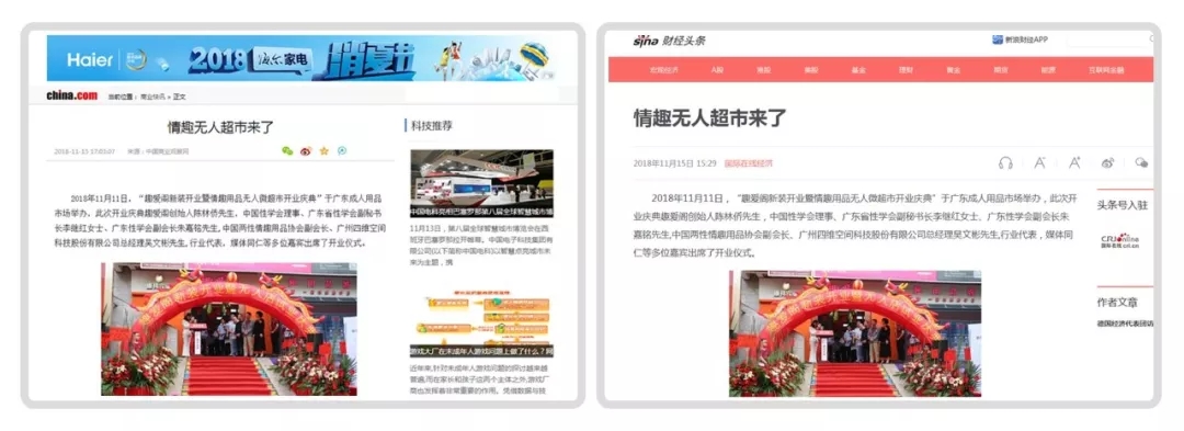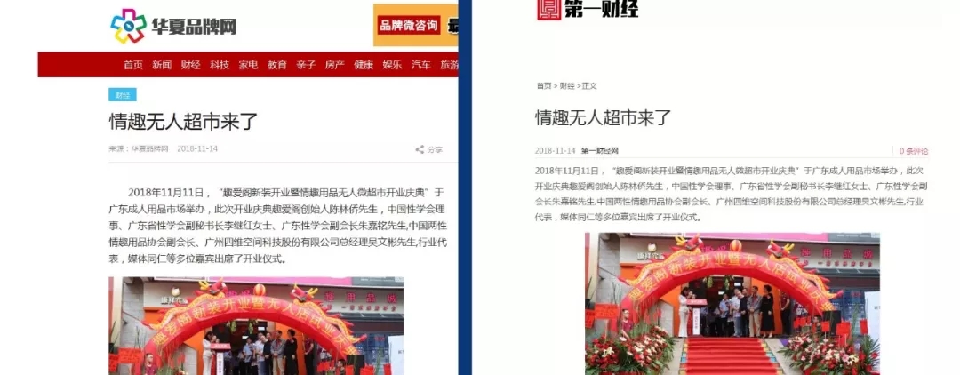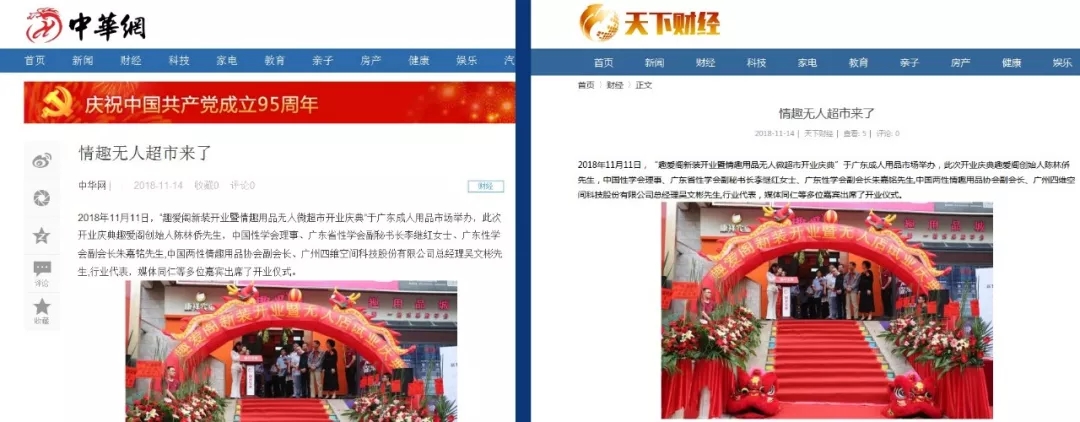 2018年11月11日,廣州康祥實業 — 趣愛閣情趣用品商城在廣東成人用品市場舉辦了隆重的新裝開業儀式,同時宣布廣州第一家情趣用品“無人微超市”正式試業運營。連日來,受新浪、中華網、搜狐、鳳凰網、慧聰網等10多家新聞媒體聚焦報道,數百家新聞門戶網站轉載。